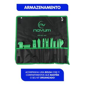 ESPECIFICAÇÕES TÉCNICAS: - Cor: Verde - Embalagem: Kit com 11 espátulas - Acessório: Acompanha estojo para guardar e organizar - Aplicações: Ideal para remoção de laterais de portas, som, guarnições, painéis de instrumentos e molduras - Benefícios: Facilidade na remoção, alta resistência e durabilidade
