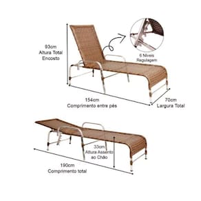 ESPECIFICACOES TECNICAS: Espreguicadeira Catar: - Altura: 37 cm - Largura: 62 cm - Profundidade: 195 cm - Suporta ate 200 kg - Com regulagem