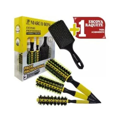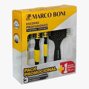 KIT PROFISSIONAL 3 ESCOVA CERAMICA RAQUETE FLEXIVEL MARCOBONIContém:01un Escova térmica cerâmica P 35mm01un Escova térmica cerâmica M 47mm01un Escova térmica cerâmica G 57mm01un Escova Raquete Escova Profissional com base de cerâmica, agiliza secar os cabelos pois mantém a temperatura do secador.Com cabo emborrachado, anatômico, pontiagudo para auxiliar a separação de mechas. Cerdas de dupla altura de nylon e naturais de javali, que proporcionam maior tração aos fios. Desliza com mais facilidade nos cabelos.Seca, alisa, modela e finaliza. Para todos os tipos de químicas.IMPORTANTE: Para conservar sua escova, o ideal é manter uma distância mínima de 7 a 10 centímetros do secador. Escova RaqueteA escova raquete desembaraçante tem cerdas flexiveis é excelente para cabelos finos, cacheados, com mega hair e peruca. Desembaraça o cabelo molhado sem quebrar o fio.Para conservar a sua escova armazene-a com cuidado para não amassar as cerdas.