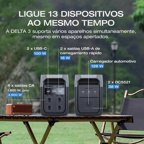 Estação de energia EcoFlow DELTA 3 com potência de 1.800W (pico 3.600W), entradas CA 1.500W, solar