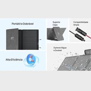 MPPT 500W e veicular 800W, expansível até 5 kWh. Painel solar dobrável 160W com eficiência de 21–22%,