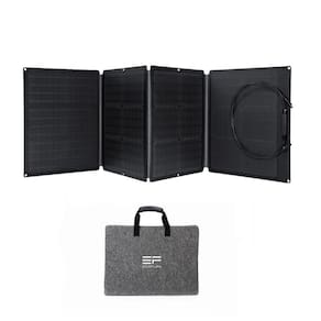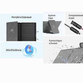 Painel Solar Dobrável EcoFlow 110W: Painel com células monocristalinas e eficiência de até 23%. Estrutura dobrável e leve com proteção IP68 contra poeira e água. Acompanha conector MC4 com cabo incluso.