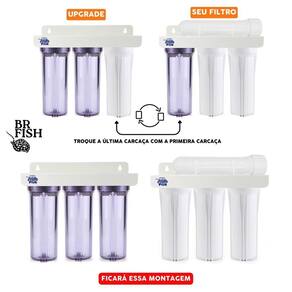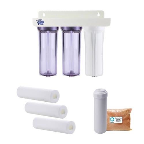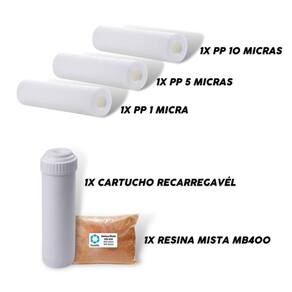 Kit com 2 carcaças transparentes, 1 carcaça branca, suporte triplo, conectores, refis de polipropileno de 10, 5 e 1 micra, cartucho recarregável com resina mista mb400, mangueiras branca e amarela de 2 metros cada.Função retrolavagem