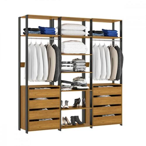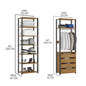 Detalhes do Produto: Kit composto por 01 módulo 6101 -prateleira- com largura de 70 cm, altura de 220 cm, profundidade de 45 cm e peso de 30 kg, e 02 módulos 6105 -gaveteiro com 4 gavetas e cabideiro- com largura de 70 cm, altura de 220 cm, profundidade de 45 cm e peso de 43 kg cada. Ideal para compor closets abertos, escritórios ou espaços multifuncionais, com estrutura robusta e visual contemporâneo.