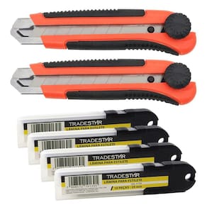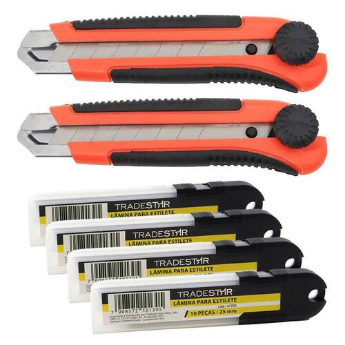 Kit c/: 02 estilete Profissional 25mm com Trava Emborrachado Tradestar 04 jogos Refil Lâmina para Estilete Largo 25mm