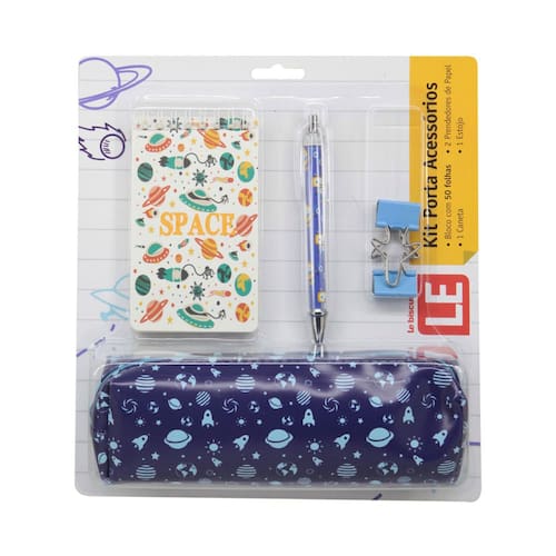 Kit Gift space porta acessórios com 05 peças. O conjunto acompanha 01 estojo basic decorado, 01 caneta decorada, 02 binder clips e 01 mini caderneta para anotações 50 folhas. Excelente opção de presente para quem gosta de organizar as atividades do dia a dia, com qualidade, estilo e praticidade.