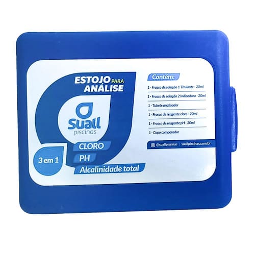 O Kit Estojo Para Teste/Análise 3 em 1 da Suall é a solução ideal para manter a qualidade da água da sua piscina. Com medidores e reagentes para análise de cloro, pH e alcalinidade total, este kit garante resultados precisos e rápidos, facilitando a manutenção. O uso regular permite ajustar o tratamento da água, proporcionando conforto e segurança aos banhistas. Indicado para piscinas residenciais e comerciais, o kit acompanha um estojo resistente para armazenamento e transporte.