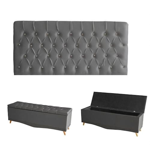 Kit Estrela Cabeceira De Cama Painel E Calçadeira Baú Botão Cristal Casal 140 Cm Suede Grafite Eli Móveis E Decoração - Cinza