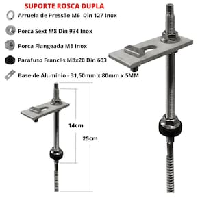 10 parafuso com rosca dupla em aço inox: m8x250mm 10 chapa de fixação em alumínio: 82x32x6mm 30 porcas sextavadas flangeadas serrilhadas em aço inox: m-8 10 anel para vedação em borracha: m8x13mm 10 parafuso cabeça martelo em aço inox: m-8x20mm 10 arruela de pressão em aço inox: m-8 10 porca sextavada em aço inox: m-8