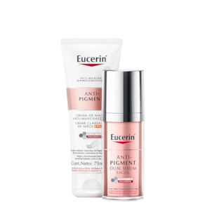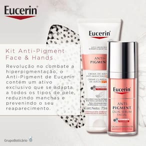 Kit com creme para mãos e sérum clareador de manchas. Kit Eucerin Anti-Pigment Face & Hands é ideal para reduzir a hiperpigmentação das mãos e do rosto e evitar o reaparecimento de manchas, tornando a pele mais uniforme e radiante.