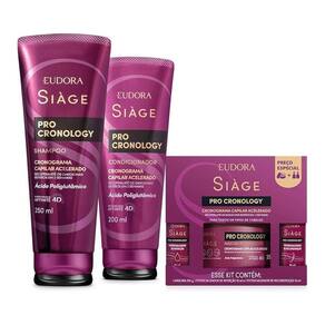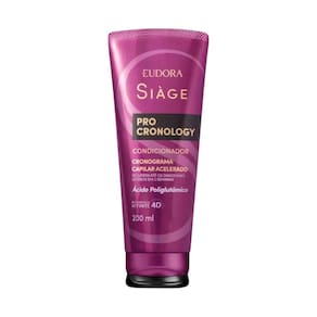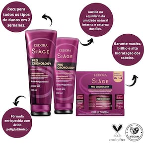 Cronograma capilar acelerado capaz de recuperar todos os tipos de danos em 2 semanas. A linha pausa a degradação e o desgaste do fio e recupera os danos mais severos em todos os tipos de cabelo. Toda a linha possui fórmulas enriquecidas com Ácido Poliglutâmico: ativo biotecnológico que auxilia no equilíbrio da umidade natural interna e externa dos fios, garantindo maciez, brilho e alta hidratação dos cabelos. O Condicionador Siàge Pro Cronology possui ação ultra condicionante que sela as cutículas e garante que o tratamento seja mantido no fio, deixando-os mais fortes e maleáveis.