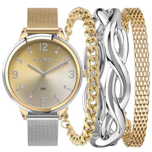 O Kit Euro Feminino Soul Bicolor é a definição de elegância com um toque moderno. O destaque fica por conta da harmonia entre o dourado e o prateado, que tornam esse conjunto uma escolha sofisticada e versátil para diversas ocasiões. Composto por um relógio de design clean e três pulseiras estilosas, é perfeito para mulheres que valorizam acessórios refinados e contemporâneos.