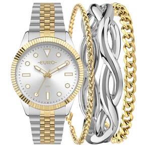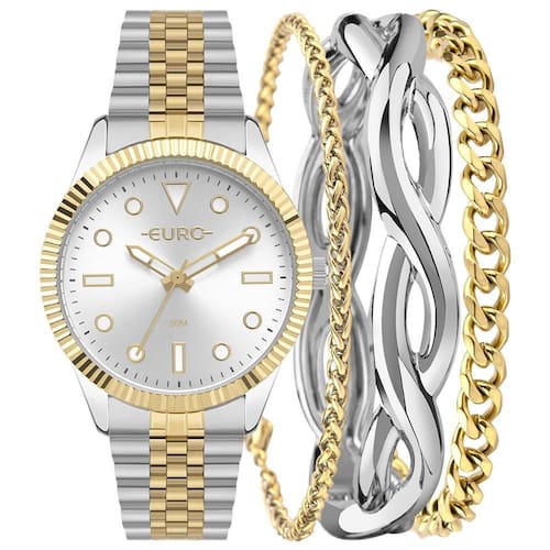 O Kit Euro Feminino Soul Bicolor EU2035YXO/K4K é a combinação perfeita entre sofisticação e versatilidade. O relógio possui caixa de 40mm em metal com aro canelado dourado e mostrador prateado, proporcionando um visual clássico com toque moderno. Os ponteiros e marcadores dourados complementam o design refinado.