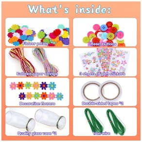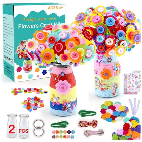 ARTESANAL DE FLOR PARA 2 Toneladas de flores de feltro, botões e cordas coloridas, 2 garrafas de vidro não como outras garrafas de plástico e 3 folhas de adesivos de gemas 3D, etc., este kit de artesanato de flores vem com tudo que você precisa EMBALAGEM PRONTA PARA PRESENTE Não se preocupe com a embalagem A linda caixa azul está pronta para embrulhar e dar. Um presente para o Natal, feriados ou aniversário. FÁCIL DE JOGAR E DOCE Inclui instruções detalhadas passo a passo, adequadas para crianças de 5 a 12 anos. também os buquês acabados podem ser servidos como presentes doces para pais, professores, etc. LIVITE SUA CASA permite que suas meninas abracem seu lado criativo, fazendo uma criação única. Também é uma bela decoração animada para sua casa. SÓ PARA VOCÊ A qualidade é nossa prioridade, se não estiver completamente satisfeito. Aproveite suas compras agora Marca: Não Informado