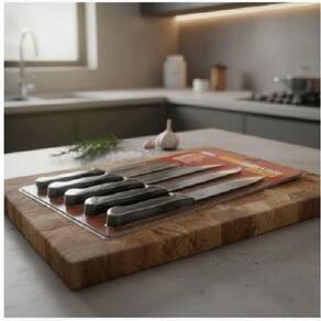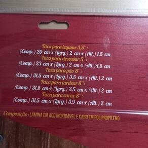Composição e medidas c l a Faca para legumes 3,5 - 20x2x1,5cm Faca para desossar 5 - 23x2x1,5cm Faca para pão 8 - 31,5x3,5x2cm Faca para larderar 8 - 31,5x3,5x2cm Faca para carne 8 - 31,5x3,9x2cm