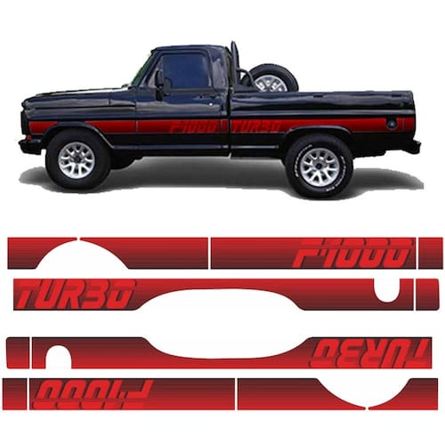 Conjunto de faixas decorativas para laterais da Caminhonete Ford F1000 Turbo modelo 1991. Especificações Técnicas: Fabricado no mesmo processo de impressão, padrão de tamanho e cores do modelo de fábrica; Confeccionada com matéria prima 3M ou Avery; Possui aplicação de verniz U.V. que oferece proteção contra efeitos do Sol, chuva, vento e arranhões. Kit Composto de: Jogo de faixas decorativas autoadesivas para as duas laterais do veículo. Importante: O valor anunciado referese ao kit descrito acima. As peças não são vendidas separadamente. Garantia de 1 ano contra defeitos de fabricação. Não nos responsabilizamos pela má instalação ou mau uso do produto, para evitar transtornos procure um profissional especializado. Instruções para Instalação: Antes da instalação limpe a superfície onde será aplicado o adesivo, certifiquese de que esteja sem nenhum vestígio de poeira ou outros resíduos, que podem impedir a fixação perfeita do produto. Não instalar sobre a lataria quente. Aconselhamos que leve a um profissional especializado que faça a instalação corretamente e termine com um ótimo acabamento sem afetar a durabilidade do produto. Não utilize produtos químicos, pois podem agredir a faixa diretamente. Ean: 7908022501747