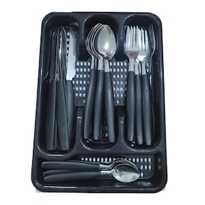 Conj de talheres + porta talher O Conjunto de talheres com porta talher é um conjunto de utensílios de mesa composto por talheres básicos, como garfos, facas, colheres e colheres de chá, acompanhados de um prático porta talheres para armazenamento e transporte conveniente. Esse conjunto é ideal para uso em casa, em viagens, acampamentos, piqueniques e outras ocasiões em que seja necessário levar os talheres consigo. Os talheres são compostos por aço inoxidável de alta qualidade e um porta talher feito de plástico durável. Os talheres são fabricados em aço inoxidável, um material conhecido por sua resistência à corrosão e durabilidade. Eles são projetados para serem resistentes e duráveis, permitindo o uso contínuo sem enferrujar ou corroer, mesmo com o contato frequente com alimentos e água.