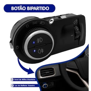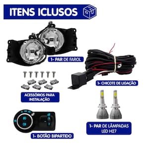 ITENS INCLUSOS: 02 - Faróis de Milha; 01 - Botão Painel Bipartido (iluminação Azul); 01 - Kit Chicote Elétrico; 01 - PAR de Lâmpadas LED.