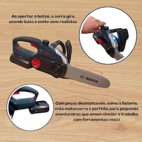 - Motosserra Bosch: Com serra removível, luz e som, essa motosserra vai fazer a imaginação do seu pequeno voar alto