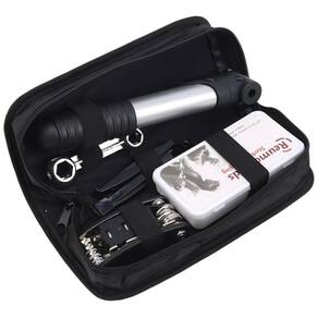 -2 Bomba de ar com adaptador para bico -3 Kit Reparo Para Os Pneus -4 Alavancas de remoção de pneus -5 Bolsa Protetora Dimensões aproximadas 22x10x5cm Marca: Kaizu Imports Ean: 7893310072231