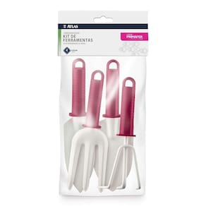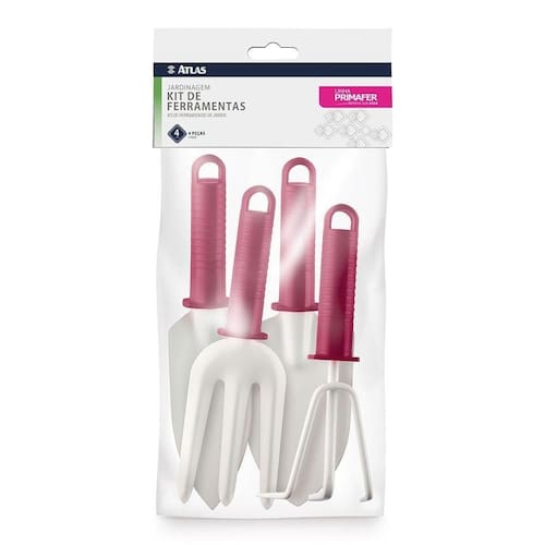 O Kit Ferramentas de Jardim Plástico Bordô/Branco Jardinar Atlas 4 Peças é ideal para o preparo e plantio de pequenas hortas. Os itens possuem ponteira de aço resistente com pintura epóxi e cabo de plástico texturizado. O kit contém: - Pá de Mão para Jardim Estreita com Cabo Plástico Bordô/Branca Atlas; - Pá de Mão para Jardim Larga com Cabo Plástico Bordô/Branca Atlas; - Escardilho de Mão para Jardim 3 Dentes com Cabo Plástico Bordô/Branco Jardinar Atlas; - Garfo de Mão para Jardim 3 Dentes com Cabo Plástico Bordô/Branco Jardinar Atlas.