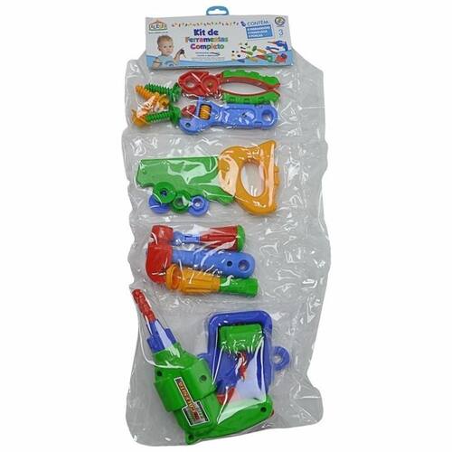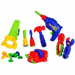 - Itens inclusos: 1 furadeira, 1 morsa, 1 alicate, 1 chave de fenda, 1 chave de boca, 1 chave inglesa, 1 serrote, 1 martelo, 4 parafusos, 4 porcas.
