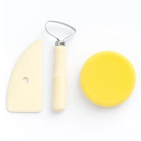 Contém 8 ferramentas para modelagem: - Costela de metal - Agulha de modelagem - Ferramenta de corte com laço - Faca de madeira - Raspador de metal - Fio de corte - Esponja