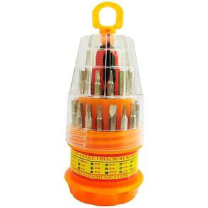 Jogo de chave 31 em 1 portátil que é ideal para pequenos reparos. São 31 tipos diferentes de chaves removíveis feitas com aço inox para serem duráveis, o cabo é emborrachado para evitar choques em itens eletrônicos e acompanha um estojo para manter tudo organizado