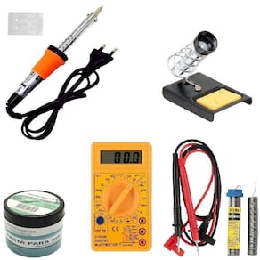 Kit Ferro De Solda Multímetro Suporte Pasta Tubete 55w 220v ATENÇÃO ESCOLHA A VOLTAGEM E O WATTS NO CAMPO DE OPÇÕES! Kit composto por 5 produtos 1* Ferro de SoldaO Ferro de solda é indicado para soldagem de componentes eletrônicos e de outros pequenos reparos.Com rápido aquecimento e manutenção da temperatura, proporciona maior produtividade na utilização.- Potência: Escolher as opções disponíveis.- Tensão: escolher as opções disponíveis. 2* Solda estanho em tuboO estanho para solda em tubo é de fácil utilização, vem em fio de 1 mm com fluxo interno que ajuda na aderência e soldagem.Para pequenos reparos em elétrica, eletrônica, instalação de CFTV, alarmes e outros, seja hobby ou .Apropriado para pequenos reparos por meio de ferro de solda. 3* Pasta para solda 110mgA pasta para soldar 110g é um produto que tem como finalidade garantir o contato elétrico entre as partes que serão soldadas e garantir resistência mecânica. O não uso deste produto pode tornar difícil o processo de soldagem, pois a solda pode escorrer ou grudar em locais onde não deveria. 4* Multímetro digital DT830 Modelo compacto O multímetro digital compacto apresenta resposta rápida, com tela lcd de fácil leitura, leve e portátil, que é muito adequado para uso na escola, em casa, na fábrica e para profissionais e amadores. 5* Suporte de Ferro de Solda com esponja vegetalSuporte de ferro de solda com esponja vegetal, traz para o de eletrônica uma solução simples e eficaz para o repouso do seu ferro de solda. Com o tamanho do bocal superior a 40mm de diâmetro, ele pode ser utilizado com a maioria dos ferros de solda convencional, tornando assim seu trabalho muito mais rápido e .