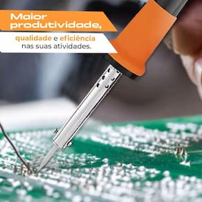 O ferro de solda é utilizado para unir duas partes metálicas, como fios condutores, placas de circuito e demais componentes, por meio da solda. O ferro de solda com rápido aquecimento e manutenção da temperatura, proporciona maior produtividade na utilização.