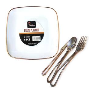 Um kit com 6 pratos quadrados de acrílico na cor rosê e 18 talhares é uma opção elegante e prática para servir em eventos e festas. Este tipo de kit é ideal para quem busca uma apresentação bonita e ao mesmo tempo descartável ou fácil de limpar.
