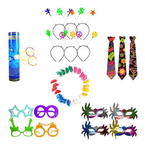 Conteúdo: 100 Pulseiras Neon, 12 Colares Havaianos, 12 Máscaras Holográficas, 12 Gravatas de Festa, 5 Óculos de Festa e 5 Tiaras de Festa