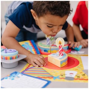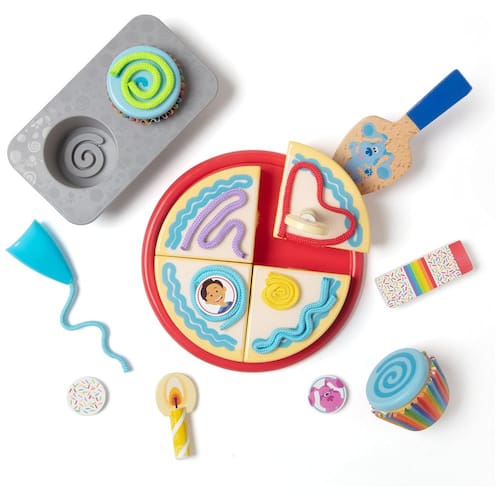 Celebre aniversários e ocasiões especiais com o conjunto de jogos Blues Clues You Este conjunto inclui 2 cupcakes de madeira e um bolo de madeira de 4 peças para decorar com cordões coloridos e coberturas de madeira. As coberturas aderem às abas autoadesivas e são facilmente removidas para que o conjunto possa ser utilizado repetidamente. O conjunto também inclui uma forma de cupcake de madeira, mangas de cupcake, prato de servir, velas de aniversário de madeira, garrafa shaker de granulado, convite, livreto de atividades, sacola e mais cabos. Este conjunto de jogos promove a preparação para o jardim de infância, inspirando confiança, capacitação e gentileza em crianças em idade pré escolar à medida que desenvolvem suas habilidades sociais, de desenvolvimento e de resolução de problemas por meio de brincadeiras. É um ótimo presente para crianças em idade pré escolar, de 3 a 5 anos, para brincadeiras práticas e sem tela. As peças são armazenadas em uma bolsa resistente para fácil limpeza.