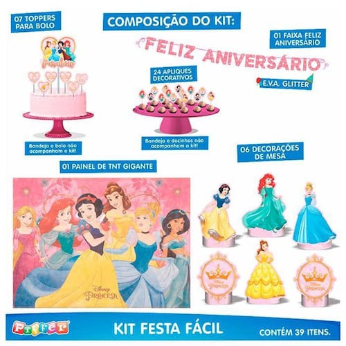Atenção: imagens meramente ilustrativas.Não faremos alterações de cores, tamanhos, formatos e números- kit festa fácil - princesas - pifferContém:- 39 peças distribuídas em:01 - faixa feliz aniversário - eva e glitter / letra f - medida: 10 cm x 8 cm01 - painel tnt grande - tecido tnt - medida: 1,40 m x 1,03 m06 - decorações de mesa - eva e papel cartão - tamanhos variados.07 - toppers para bolo - eva e papel cartão - tamanhos variados.24 - apliques decorativos.Kit festa fácil decoração das princesas.Perfeito para festinhas em casa, na escola, na creche.Esse kit conta com enfeites para mesa, toppers para bolo, apliques decorativos para docinhos. Tem um painel gigante de tnt, com 1,40m, para decorar a parede Esse super kit é composto de produtos com impressão de alta definição no eva, retratando com fidelidade detalhes dos personagens e do tema, e garantindo a qualidade e durabilidade do produto. Tenha a decoração de uma festa completa em apenas uma embalagem prática e objetivaGaranta já o seuAtenção:O kit não acompanha, balões, mesa, tapetes, apenas os itens citados acima na descrição do mesmo