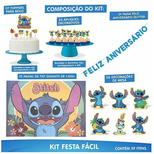 Atenção: imagens meramente ilustrativas.Não faremos alterações de cores, tamanhos, formatos e números- kit festa fácil - stitch - pifferContém:- 39 peças distribuídas em:01 - faixa feliz aniversário - eva e glitter / letra f - medida: 10 cm x 8 cm01 - painel gigante t.N.T. 1,40m04 - decorações de mesa - eva e papel cartão - tamanhos variados.07 - toppers para bolo - eva e papel cartão - tamanhos variados.24 - apliques decorativos.Kit festa fácil decoração do stitch.Perfeito para festinhas em casa, na escola, na creche. Esse kit conta com enfeites para mesa, toppers para bolo, apliques decorativos para docinhos. Tem um painel gigante de tnt, com 1,40m, para decorar a parede Esse super kit é composto de produtos com impressão de alta definição no eva, retratando com fidelidade detalhes dos personagens e do tema, e garantindo a qualidade e durabilidade do produto. Tenha a decoração de uma festa completa em apenas uma embalagem prática e objetivaGaranta já o seuAtenção:O kit não acompanha, balões, mesa, tapetes, apenas os itens citados acima na descrição do mesmo