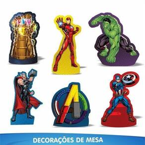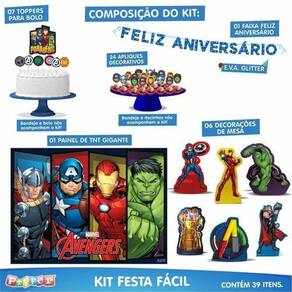 Perfeito para festinhas em casa, esse SUPER KIT conta com enfeites para mesa, toppers para bolo, apliques decorativos para docinhos, faixa Feliz Aniversário exclusiva, em EVA de Glitter, proporcionando muito mais brilho à festa, além de ser o único kit do mercado a ter um painel gigante de TNT, com 1,40m, para decorar a parede O grande diferencial dos produtos que compõem o kit é a impressão de alta definição no EVA, retratando com fidelidade detalhes dos personagens e do tema, e garantindo a qualidade e durabilidade do produto. Tenha a decoração de uma festa completa em apenas uma embalagem. Imagens meramente ilustrativas. As bandejas, doces, o bolo, o arco e os balões não acompanham o kit. Conteúdo da Embalagem e Composição: 06 enfeites para mesa, 07 toppers para bolo, 24 apliques decorativos - Fabricados em EVA com impressão de alta definição; 01 faixa Feliz Aniversário - Fabricada em EVA Glitter, acompanha fita de cetim; 01 painel TNT - TNT 40grs. Estampado com tinta à base de água. contra defeito de fabricação. Prazo de Validade: Indeterminado. Produto oficial licenciado Marvel. Marca: Não Informado