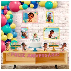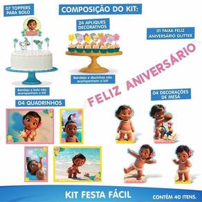 Prepare-se para uma festa encantadora com o nosso Kit Festa Moana Baby Conteúdo da Embalagem e Composição 06 enfeites para mesa: Adicione um toque mágico à sua decoração com esses encantadores enfeites de mesa. Eles são perfeitos para criar uma atmosfera temática da Moana 07 toppers para bolo: Transforme seu bolo em uma obra-prima com nossos toppers personalizados. Cada detalhe irá surpreender seus convidados e tornar o momento do parabéns ainda mais especial. 24 apliques decorativos: Com esses apliques decorativos em EVA, você pode adicionar um charme único aos seus convites, lembrancinhas ou onde a sua imaginação desejar. A impressão em alta definição proporciona um visual deslumbrante 01 faixa Feliz Aniversário: Celebre o momento com a nossa faixa exclusiva Feliz Aniversário. Fabricada em EVA com glitter, ela adiciona brilho e glamour à sua decoração. Acompanha fita de cetim para facilitar a fixação. 01 painel TNT: Dê um toque especial ao ambiente com o nosso painel gigante de TNT estampado. Com 1,40m de altura, ele cria um cenário impressionante. Fabricado com tinta à base de água, é seguro e ecologicamente correto. Produto licenciado Disney Nós levamos a magia da Disney para a sua festa Tenha a certeza de que está adquirindo um produto oficial e de alta qualidade, com todos os detalhes cuidadosamente projetados para capturar a essência da Moana. Imagens meramente ilustrativas Observe que as bandejas, doces, o bolo, o arco e os balões não estão inclusos no kit. As imagens são apenas para ilustração, mostrando como você pode combinar os itens do kit e criar uma festa incrível. Deixe sua criatividade fluir Prepare-se para viver momentos mágicos com o Kit Festa Moana Baby. Adquira o seu agora mesmo e crie uma festa inesquecível que encantará todos os convidados Ean: 17899061543799