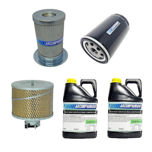 Kit de Filtros e 10L de Óleo Lubrificante Similares para Compressor Rotativo de Parafuso Techto Platinum TB 10. O kit contém: