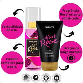 O Kit Nuit Rose da Fiorucci é a escolha perfeita para quem deseja viver uma verdadeira experiência sensorial de sofisticação, romantismo e sensualidade. Este conjunto encantador combina a exuberante Deo Colônia Splash Nuit Rose com a deliciosa Loção Hidratante Desodorante Nuit Rose, criando uma fusão irresistível de fragrâncias florais e frutadas que envolvem e encantam por onde quer que você passe. Ideal para mulheres que exalam charme e elegância, este kit traz uma fragrância envolvente que se adapta a qualquer momento do dia ou da noite, elevando a autoestima e destacando a feminilidade com cada aplicação.