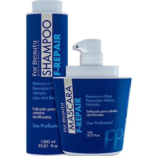 For Beauty F-Repair - Kit de Restauração Capilar Duo 2 Produtos A linha F-Repair For Beauty Professional Care é formulada com Complexo Quadramínico, Proteína de Queratina Hidrolisada e Aminoácidos essenciais. É especialmente indicada para quem realiza procedimentos químicos constantes, misturando alisamento, descoloração e tintura, o que requer cuidados especiais. Repara as fibras capilares danificadas, porosas e ressecadas por conta de consecutivos procedimentos químicos. ContémFor Beauty F-Repair - Shampoo de Restauração Capilar 1LFor Beauty F-Repair - Máscara de Restauração Capilar 1L Modo de UsarAplique uma pequena quantidade de Shampoo nas mãos e passe no couro cabeludo. Massageie suavemente até formar espuma. Enxágue completamente. Se necessário, repita a operação. Aplique uma pequena quantidade da Máscara sobre os cabelos, massageando do meio até as pontas, evitando a raiz. Se preferir, utilize touca térmica para potencializar o resultado. Após uma pausa entre 10 a 15 minutos, enxágue completamente para retirar o produto.