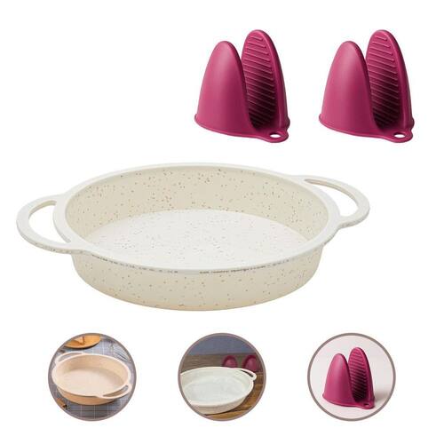 Distribuído por feheros shop kit forma de silicone redonda 25cm com alça iron e 2 luvas térmicas silicone Atenção O kit forma de silicone com 2 luvas térmicas é ideal para quem busca segurança e praticidade no preparo de receitas no forno, micro-ondas ou air fryer. A forma garante assados perfeitos com facilidade na hora de desenformar, enquanto as 2 luvas térmicas oferecem proteção completa para as mãos ao manusear itens quentes. A forma possui estrutura reforçada com alças iron, que garantem firmeza no transporte. O silicone de alta qualidade é livre de bpa e distribui o calor de maneira uniforme. As luvas de silicone protegem suas mãos do calor intenso, permitindo retirar formas e panelas do forno ou fogão sem riscos de queimaduras. Informações do produto A forma assadeira redonda de silicone 25cm é flexível, durável e compatível com forno, micro-ondas, air fryer, freezer e lava-louças. Sua superfície antiaderente facilita o preparo de bolos, tortas e outras receitas sem que os alimentos grudem. As 2 luvas térmicas de silicone foram desenvolvidas para suportar altas temperaturas de até 230c. São confortáveis, seguras e garantem aderência firme ao segurar formas, panelas e utensílios quentes. Especificações técnicas: - seguro para a saúde: livre de substâncias tóxicas como bpa. - resistente: suporta altas temperaturas do forno e airfryer sem deformar ou derreter. - versátil: pode ser para assar bolos, tortas, pães e muito mais. - fácil de limpar: pode ser lavado à mão ou na lava-louças. Ficha técnica Forma assadeira redonda: - material: silicone e ferro - diâmetro: 24,7cm - altura: 4,7cm - peso: 250g - cor: branco - temperatura suportada: até 230c - livre de bpa - compatível com forno, micro-ondas, air fryer, freezer e lava-louças Luva térmica de silicone: - material: silicone resistente - altura: 8,5cm - largura: 9cm - cor: vinho - temperatura suportada: até 230c - tamanho universal - quantidade: 2 unidades Antes do primeiro uso - lave todos os itens com água morna e detergente neutro. - na forma, aplique uma fina camada de óleo vegetal, leve ao forno a 180c por 20 minutos e lave novamente para ativar o antiaderente. Após o uso - deixe os produtos esfriarem naturalmente antes de lavar. - lave a forma com esponja macia ou na lava-louças. - as luvas podem ser lavadas à mão com sabão neutro, evitando produtos abrasivos. Itens inclusos no pacote - 01 forma assadeira redonda silicone antiaderente 25cm com alça iron - 02 luvas térmicas de silicone resistente para forno e fogão Todas as fotos são reais dos produtos. Qualquer dúvida estamos à disposição. Dúvidas frequentes 01 - o silicone da forma é seguro para uso com alimentos R: sim. A forma é feita em silicone de alta qualidade e livre de bpa. 02 - preciso untar a forma antes de usar R: sim. Recomendamos uma leve camada de óleo ou para facilitar o desenforme. 03 - as luvas podem ser lavadas na máquina de lavar louças R: não. Indicamos lavagem manual com sabão neutro para maior durabilidade. 05 - como posso acompanhar o envio R: após a confirmação do envio, você receberá um código de rastreamento para acompanhar seu pedido.