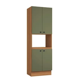 Com até sete camadas de pintura, a caixaria possui acabamento touch na cor canela, com a textura dos veios da madeira, enquanto as portas, em MDP e acabamento BP, são mais resistentes contra riscos, arranhões e gotas d'água, e na cor verde frevo, possuem acabamento fosco. Uma combinação aconchegante e moderna, que dará ainda mais destaque ao seu espaço, remetendo aos tons da natureza e deixando sua cozinha perfeita.