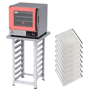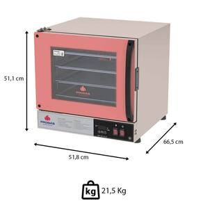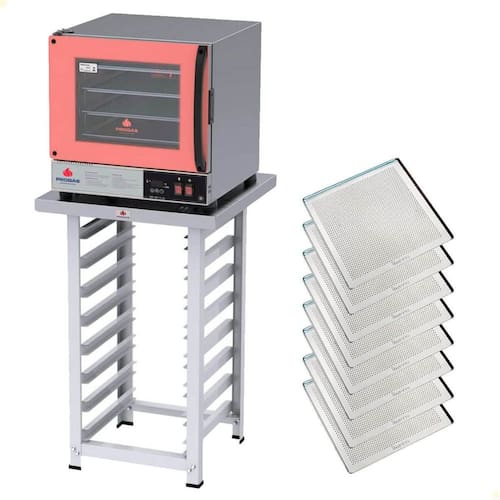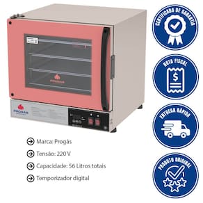 INFORMAÇÕES DO FORNO TURBO ELÉTRICO PROGÁS PRP-004 PLUS - Acompanha 4 esteiras de alumínio perfuradas de 350x350mm - Sensor de temperatura blindado; - Capacidade: 39 litros úteis e 56 litros totais; - Resistência blindada de 2000W; - Lâmpada halógena de 35W; - Consumo médio: 1,5 kWh - Motor monofásico de 1/30CV; - Isolamento térmico com lã basáltica; - Porta de vidro temperado; - Tensão: 220V; - Puxador em polímero isolante de alta resistência. - Cozimento uniforme, com temperatura máxima de 250ºC - Material: Aço inox escovado. - LED sinalizador. - Temporizador digital.