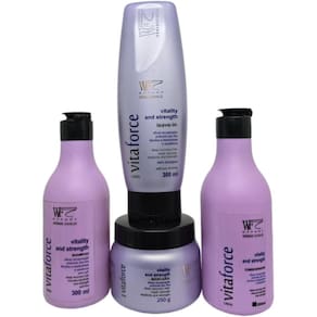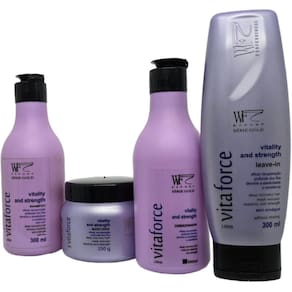 Vitaforce Eficaz recuperação profunda dos fios Devolve elasticidade e resistencia. A linha vita force é indicada para quem quer uma recuperação completa dos fios, pois contém extrato de bambu que é rico em proteínas, sais minerais e vitaminas, que recuperam a maciez e o brilho, fortalecendo a estrutura, hidratando e selando as cutículas capilares. === Shampoo vitaforce Formulado com extrato de bambu e complexo aminoreparador que auxiliam na reconstrução da fibra capilar, devolvendo força. Elasticidade, suavidade e brilho aos cabelos. Modo de utilização: aplique o shampoo vitaforce sobre os cabelos molhados, massageando o couro cabeludo e os fios com as pontas dos dedos até obter uma espuma abundante engue bem. Para potencializar os resultados, utilize toda a ima precaucoes: uso externo. Não ingerir. === Máscara vitaforce extrato de bambu e complexo aminoreparador que auxiliam na reconstrução da fibra capilar, devolvendo força, elasticidadde, suavidade e brilho aos cabelos. Modo de utilização: após o uso do shampoo vitaforce, aplique a máscara vitaforce aos cabelos úmidos e em seu comprimento. Massageie com as pontas dos dedos e deixe agir por alguns minutos. Enxágue bem e aplique o leave in vitaforce a seguir. Pode ser Utilizado com touca térmica deixando agir por 15 minutos. Para potencializar os resultados, utilize toda a linha vitaforce. === Condicionador vitaforce Formulado com extrato de bambu e complexo aminoreparador que auxiliam na reconstrução da fibra capilar, devolvendo força, elasticidade, suavidade e brilho aos cabelos. Modo de utilização: após o uso do shampoo vitaforce aplique o condicionador vitaforce nos cabelos úmidos e em seu comprimento. Massageie com as pontas dos dedos e deixe agir por alguns minutos. Enxáge bem. Para potencializar os resultados, utilize toda a linha vitaforce. === Leave-in vitaforce Formulado com extrato de bambu e complexo aminoreparador que auxiliam na reconstrução da fibra capilar, devolvendo força, elasticidade, suavidade e brilho aos cabelos. Modo de utilização: aplicar o leave-in vitaforce em pequena quantidade. Espalhe primeiramente nas mãos e aplique no cabelo do comprimento as pontas. Não enxaguar. Para potencializar os resultados, utilize toda a linha vitaforce. Marca: Não Informado