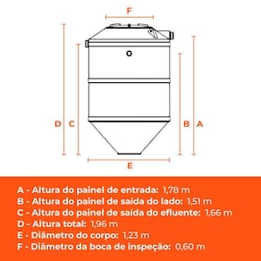 Características principais Fossa Séptica 1.500L/Dia Fortlev: Capacidade: 1.500 L/Dia Altura total: 1,96 m Diâmetro do corpo: 1,23 m