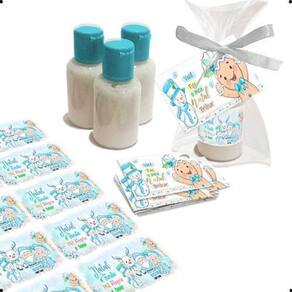 Este kit é enviado desmontado, para que você possa montá-lo na sua própria casa. As garrafinhas já vão cheias com hidratante, e os rótulos, tags, saquinhos e fitas vão separados dentro da caixa.