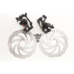 Maior poder de frenagem com baixo custo, leve e resistente... O Freio a disco Absolute possui acionamento por cabos de aço (mecânico), oferece ótimo poder de frenagem, acompanha par de discos (rotores) de 160mm, e pinças completas em alumínio com pastilhas já inclusas, formando um kit leve e resistente. Principais Características - Produto NOVO e na CAIXA - Marca: Absolute - Pinças / Caliper / Burrinho Completo em alumínio e com pastilhas já inclusas - Discos (rotores) de 160mm com 6 Furos - Peso aproximado 380g Componentes - 2x Pinças de Freio Mecânico Absolute com pastilhas - 2x Discos (rotores) de 160mm com 6 furos - 12 Parafusos de fixação dos discos (rotores) - 04 Parafusos de fixação das pinças Não acompanha cubos