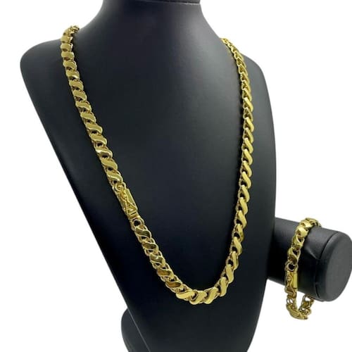 Kit Friso S 10mm + Pulseira Banhado a Ouro 18K Premium Detalhes do Produto: Material: ligas metálicas de alta qualidade, especialmente tratadas para fixação e absorção do ouro, com acabamento em verniz protetor. Aparência: visual idêntico ao ouro maciço. Produção: artesanal, com atenção meticulosa aos detalhes. Banho: 10 camadas espessas de ouro 18k, finalizadas com verniz antialérgico . Elos: soldados varia conforme o modelo . Pedras: zircônias brilhantes cravejadas quando aplicável . Tamanhos Disponíveis: Cordões Masculinos: 70cm padrão e 60cm sob consulta/Pedido Via Chat . Cordões Femininos: 50cm padrão e 45cm sob consulta/Pedido Via Chat . Pulseiras: 21cm padrão ; tamanhos de 18cm a 23cm sob consulta/Pedido Via Chat. Pingentes: conforme imagens; consulte para mais detalhes via chat. Espessuras Recomendadas para Cordões / Pingentes: P: 1mm a 4mm M: 4mm a 8mm G: 6mm a 13mm Gg: 12mm a 18mm Incluso na Compra: Saquinho de organza para armazenamento seguro. Caixa elegante, perfeita para presente. Cupom de desconto para a próxima compra. Flyer com outros produtos da coleção. Carta de agradecimento personalizada. Adesivo da marca ToJoia18k. Informações Adicionais: : 6 meses termos acompanham o produto . Devolução: 7 dias para devolução sem questionamentos. Envio: despacho em até 24 horas úteis após confirmação do pagamento. Cuidados com a Peça: Evite contato com produtos químicos; aguarde o perfume secar antes de usar. Evite contato com shampoo, condicionadores e suor excessivo. Armazene em local seco, preferencialmente no saquinho de organza fornecido. Uso no mar e piscina é permitido; lave com água corrente e sabão neutro após. Por que Escolher a ToJoia18k Semi-joias luxuosas que combinam estilo, qualidade e sofisticação. Banho espesso de ouro 18k, garantindo brilho duradouro e acabamento impecável. Design exclusivo e produção artesanal, perfeitos para qualquer ocasião. Materiais premium que asseguram durabilidade. Ao escolher uma semi-joia ToJoia18k, você investe em qualidade, elegância e uma experiência única. Aguardamos sua compra Observação: pode ocorrer variação no fecho raramente . Imagens reais, sem edição. Qualquer dúvida, estamos à disposição para esclarecimentos. Marca: Não Informado