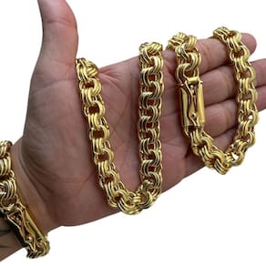 Kit Friso Triplo 12mm Corrente + Pulseira Banhado a Ouro Detalhes do Produto: Material: ligas metálicas de alta qualidade, especialmente tratadas para fixação e absorção do ouro, com acabamento em verniz protetor. Aparência: visual idêntico ao ouro maciço. Produção: artesanal, com atenção meticulosa aos detalhes. Banho: 10 camadas espessas de ouro 18k, finalizadas com verniz antialérgico . Elos: soldados varia conforme o modelo . Pedras: zircônias brilhantes cravejadas quando aplicável . Tamanhos Disponíveis: Cordões Masculinos: 70cm padrão e 60cm sob consulta/Pedido Via Chat . Cordões Femininos: 50cm padrão e 45cm sob consulta/Pedido Via Chat . Pulseiras: 21cm padrão ; tamanhos de 18cm a 23cm sob consulta/Pedido Via Chat. Pingentes: conforme imagens; consulte para mais detalhes via chat. Espessuras Recomendadas para Cordões / Pingentes: P: 1mm a 4mm M: 4mm a 8mm G: 6mm a 13mm Gg: 12mm a 18mm Incluso na Compra: Saquinho de organza para armazenamento seguro. Caixa elegante, perfeita para presente. Cupom de desconto para a próxima compra. Flyer com outros produtos da coleção. Carta de agradecimento personalizada. Adesivo da marca ToJoia18k. Informações Adicionais: : 6 meses termos acompanham o produto . Devolução: 7 dias para devolução sem questionamentos. Envio: despacho em até 24 horas úteis após confirmação do pagamento. Cuidados com a Peça: Evite contato com produtos químicos; aguarde o perfume secar antes de usar. Evite contato com shampoo, condicionadores e suor excessivo. Armazene em local seco, preferencialmente no saquinho de organza fornecido. Uso no mar e piscina é permitido; lave com água corrente e sabão neutro após. Por que Escolher a ToJoia18k Semi-joias luxuosas que combinam estilo, qualidade e sofisticação. Banho espesso de ouro 18k, garantindo brilho duradouro e acabamento impecável. Design exclusivo e produção artesanal, perfeitos para qualquer ocasião. Materiais premium que asseguram durabilidade. Ao escolher uma semi-joia ToJoia18k, você investe em qualidade, elegância e uma experiência única. Aguardamos sua compra Observação: pode ocorrer variação no fecho raramente . Imagens reais, sem edição. Qualquer dúvida, estamos à disposição para esclarecimentos. Marca: Não Informado