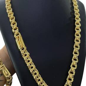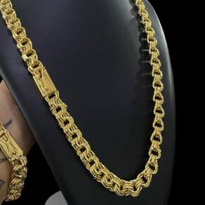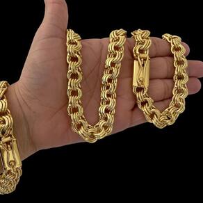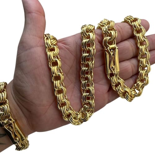 Kit Friso Triplo 12mm Corrente + Pulseira Banhado a Ouro Detalhes do Produto: Material: ligas metálicas de alta qualidade, especialmente tratadas para fixação e absorção do ouro, com acabamento em verniz protetor. Aparência: visual idêntico ao ouro maciço. Produção: artesanal, com atenção meticulosa aos detalhes. Banho: 10 camadas espessas de ouro 18k, finalizadas com verniz antialérgico . Elos: soldados varia conforme o modelo . Pedras: zircônias brilhantes cravejadas quando aplicável . Tamanhos Disponíveis: Cordões Masculinos: 70cm padrão e 60cm sob consulta/Pedido Via Chat . Cordões Femininos: 50cm padrão e 45cm sob consulta/Pedido Via Chat . Pulseiras: 21cm padrão ; tamanhos de 18cm a 23cm sob consulta/Pedido Via Chat. Pingentes: conforme imagens; consulte para mais detalhes via chat. Espessuras Recomendadas para Cordões / Pingentes: P: 1mm a 4mm M: 4mm a 8mm G: 6mm a 13mm Gg: 12mm a 18mm Incluso na Compra: Saquinho de organza para armazenamento seguro. Caixa elegante, perfeita para presente. Cupom de desconto para a próxima compra. Flyer com outros produtos da coleção. Carta de agradecimento personalizada. Adesivo da marca ToJoia18k. Informações Adicionais: : 6 meses termos acompanham o produto . Devolução: 7 dias para devolução sem questionamentos. Envio: despacho em até 24 horas úteis após confirmação do pagamento. Cuidados com a Peça: Evite contato com produtos químicos; aguarde o perfume secar antes de usar. Evite contato com shampoo, condicionadores e suor excessivo. Armazene em local seco, preferencialmente no saquinho de organza fornecido. Uso no mar e piscina é permitido; lave com água corrente e sabão neutro após. Por que Escolher a ToJoia18k Semi-joias luxuosas que combinam estilo, qualidade e sofisticação. Banho espesso de ouro 18k, garantindo brilho duradouro e acabamento impecável. Design exclusivo e produção artesanal, perfeitos para qualquer ocasião. Materiais premium que asseguram durabilidade. Ao escolher uma semi-joia ToJoia18k, você investe em qualidade, elegância e uma experiência única. Aguardamos sua compra Observação: pode ocorrer variação no fecho raramente . Imagens reais, sem edição. Qualquer dúvida, estamos à disposição para esclarecimentos.